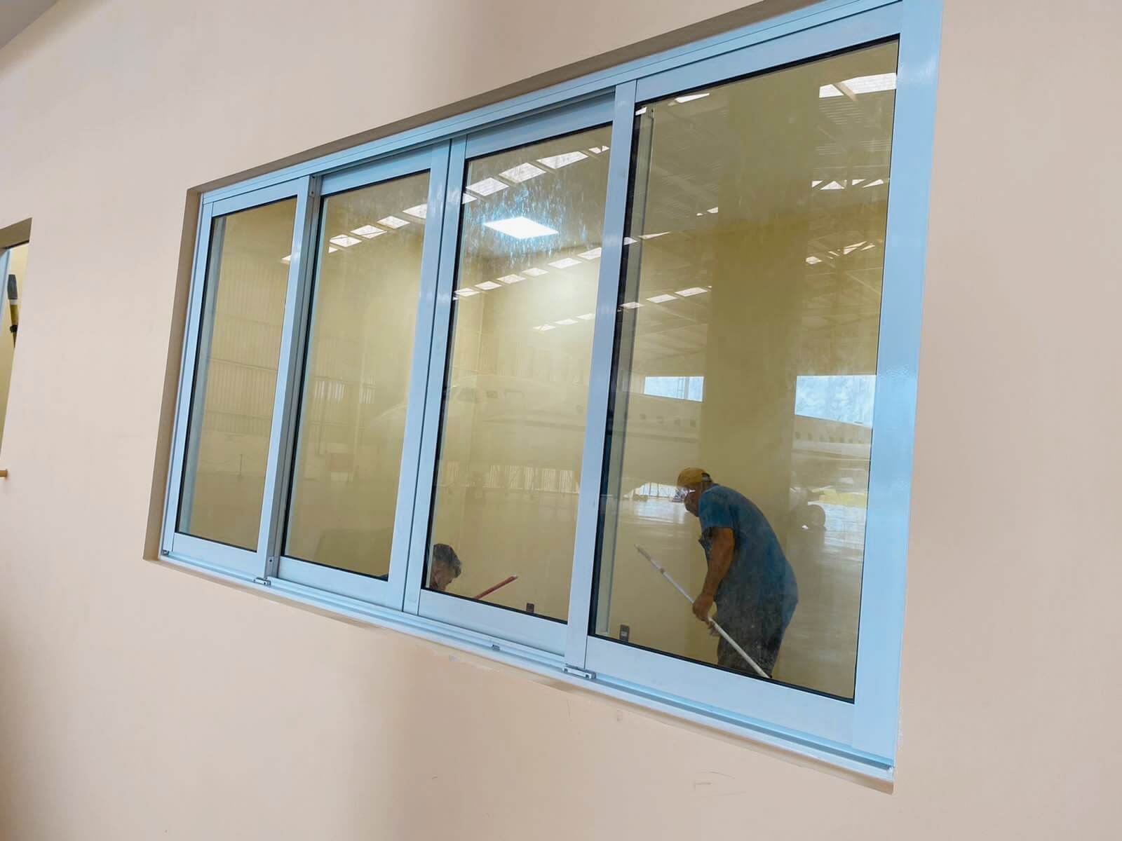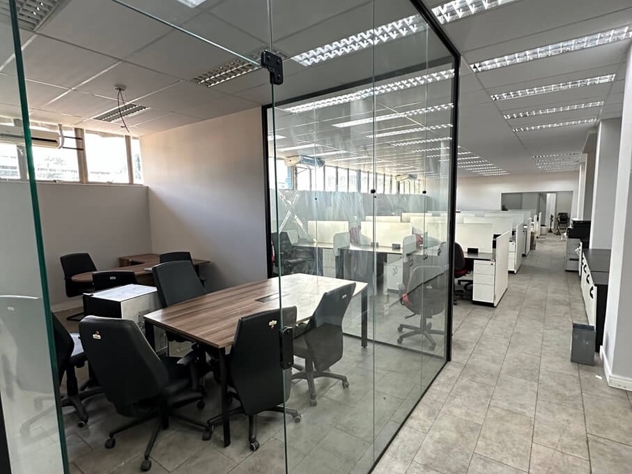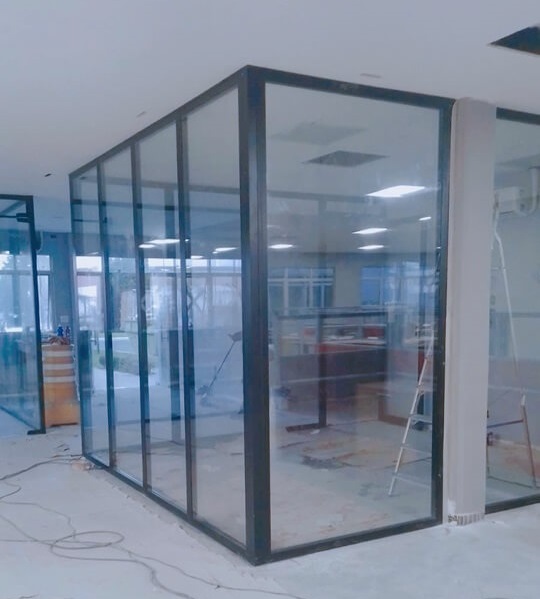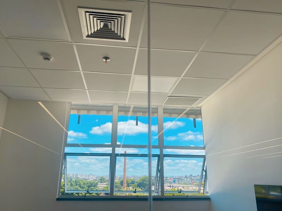 Mais informações: Divisória de escritório em vidro e portas de banheiro industrial em veneziana.